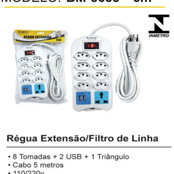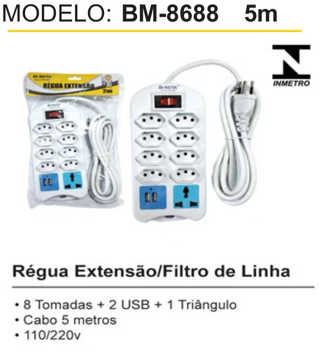 RÉGUA EXTENSORA 8TOMATAS+2USB+1TRIÂNGULO 5METRO